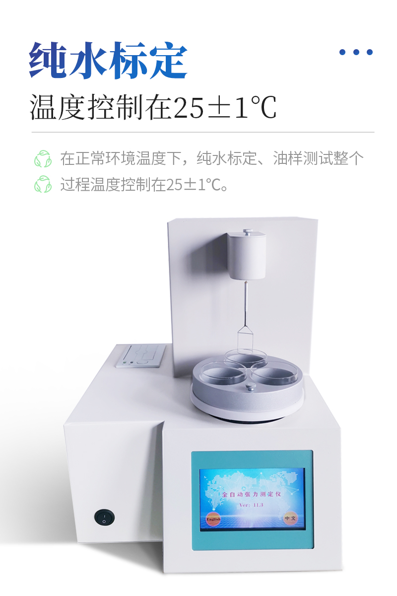 儀器特點★ 在正常環(huán)境溫度下,純水標定、油樣測試整個過程溫度控制在25±1℃?!?溫度控制采用PID自整定技術(shù)★ 樣品分析效率高,可同時放三個樣品★ 使用不同測量環(huán)儀器自動修正參數(shù)★ 自動打印試驗結(jié)果,動態(tài)張力曲線顯示★儀器采用等一點標定,簡單方便,保證測量精度;★高清晰彩色觸摸