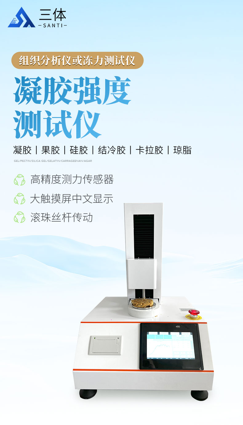 凝膠強度測儀適用于凝膠、果膠、硅膠、結(jié)冷膠、卡拉膠、瓊脂、阿拉伯膠、黃原膠、魔芋膠和瓜爾膠等的破裂強度、彈性、延展性、拉伸強度、粘附度、回復(fù)性等測試。凝膠強度測儀也叫凍力強度儀 ,明膠凝凍強度測定儀,組織分析儀或凍力測試儀。
