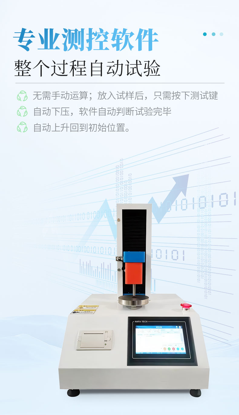 7、軟件:專業(yè)測控軟件,整個過程自動試驗,無需手動運算;放入試樣后,只需按下測試鍵,自動下壓,軟件自動判斷試驗完畢,自動上升回到初始位置。