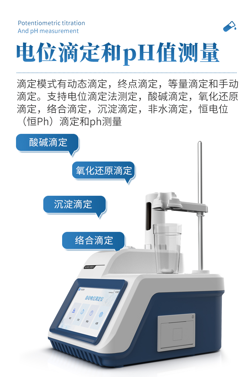 自動電位滴定儀是一種用于化學分析的精密儀器,他通過自動添加滴定劑來確定樣品中特定成分的濃度。該儀器基于電位滴定原理工作,即根據(jù)在滴定過程中電池電動勢的變化來確定滴定終點的一款滴定設(shè)備。設(shè)備滿足國家檢定規(guī)程JJG 814-2015《自動電位滴定儀》儀器級別中的0.05級別,即儀器**示值誤差為±1.5%,儀器示值重復(fù)性≤0.2%