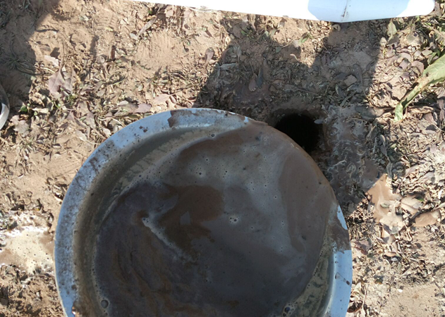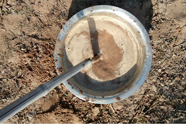 b. 將取土鉆從孔洞中取出,放到盆子里,用工具把鉆出的土收集到盆子里以用來和泥漿。(注意:初次鉆土因為雜質(zhì)過多,不做收集)