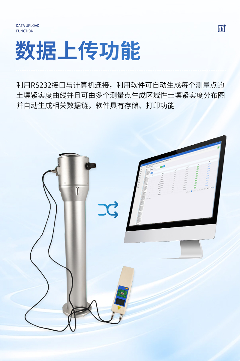 具有數(shù)據(jù)上傳功能:利用RS232接口與計算機連接,利用軟件可自動生成每個測量點的土壤緊實度曲線并且可由多個測量點生成區(qū)域性土壤緊實度分布圖并自動生成相關(guān)數(shù)據(jù)鏈。軟件具有存儲、打印功能。