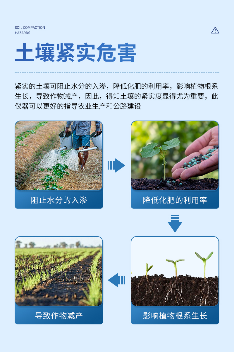 緊實的土壤可阻止水分的入滲,降低化肥的利用率,影響植物根系生長,導致作物減產(chǎn)。因此,得知土壤的緊實度顯得尤為重要,此儀器可以更好的指導農(nóng)業(yè)生產(chǎn)和公路建設。